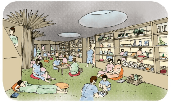 木や森をイメージしたリラックススペース。飲み放題のフリーコーヒーと、コミック・雑誌を5,000冊設置、電源・Wi-Fi完備。暖炉の周りでウトウトしたり、人工芝の上でゴロゴロしたり、思い思いのだらだらを楽しめます。