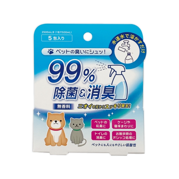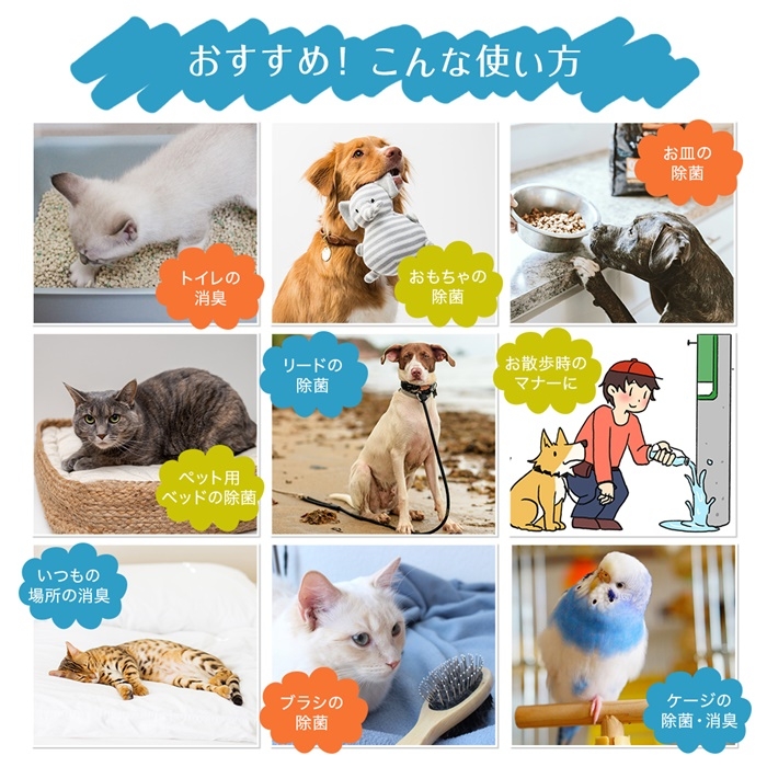 ペットのトイレ、ベッド、散歩時のおしっこの処理等の除菌・消臭としてご利用頂けます。