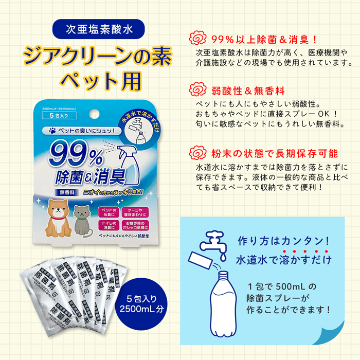「ジアクリーンの素 ペット用」は水道水に溶かすだけで次亜塩素酸水が作れます。