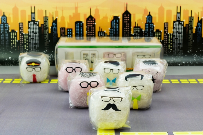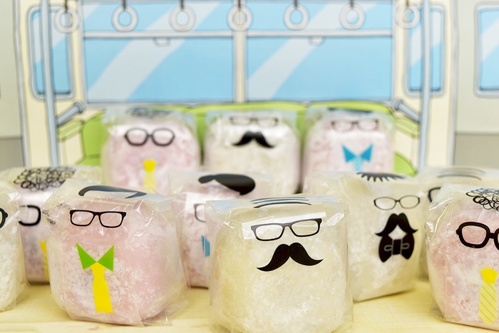 小さな電車型の箱の中に詰め込んだ大福は、当店で人気の甘さ控えめ北海道産あずきを使用したクリーム入り夢福餅と、口当たりなめらかな紫いも餡とコクのあるクリームを入れた紅福餅の2種類になっております。父の日に最適な紅白の色使いとなりました。大福を通勤するお父さんに見立て電車内に乗車、ガタンゴトンと揺られながらもクールに、じっと耐えながらがんばる姿を大福でコミカルに表現しています。