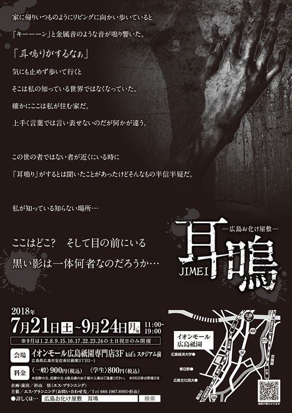 イベント企画 エス・プランニング(所在地:広島県広島市、代表:杉山 悟)は、2018年7月21日(土)~9月24日(月・祝)の期間中、「広島お化け屋敷耳鳴JIMEI」をイオンモール広島祇園で開催いたします。