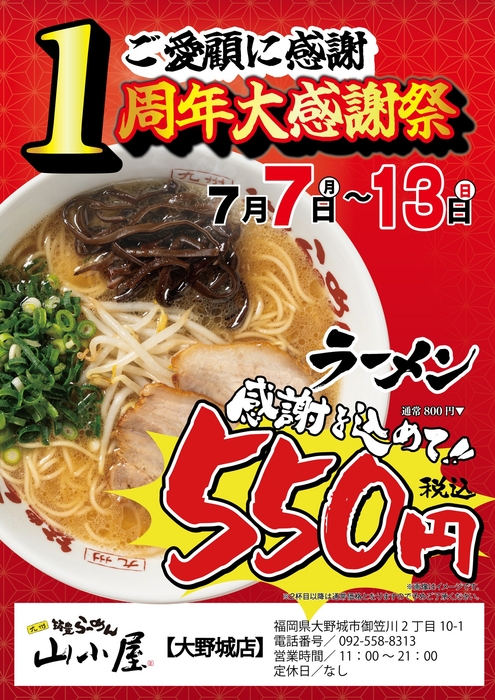 7月7日(月)~13日(日)まで、1周年大感謝祭としてラーメン通常800円のところを550円で提供しております!
