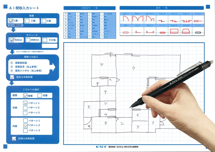 - 複合機から出力した専用の方眼紙にボールペンで間取り、建具、部屋名称を記入し、屋根形状、外装・内装の仕上げパターンを選択します。