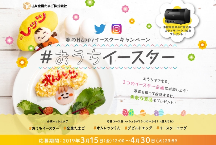 JA全農たまごTwitterアカウント「@jz_tamago」または、Instagramアカウント「@jz_tamago」をフォローしてください。当選者コースを選び、テーマに沿った写真を撮影お願いします。ハッシュタグ「#おうちイースター」、「#全農たまご」を付けて、さらにテーマごとのハッシュタグ、「#オムレッツくん」、「#デビルドエッグ」、「#イースターエッグ」のいずれかを加えて、TwitterまたはInstagramに投稿すると、それぞれのテーマごとに、抽選で、一休.comギフト 選べるペアご宿泊券(5万円相当)5名様、ロティサリーグリル&スモーク(Panasonic NB-RDX100)5名様、ポーリッシュポタリー(ポーランド食器)のお皿(19cm 2枚セット)20名様に、さらに、応募者全員の中から、オムレッツくんぬいぐるみ(ミニ)を30名様にプレゼントいたします。