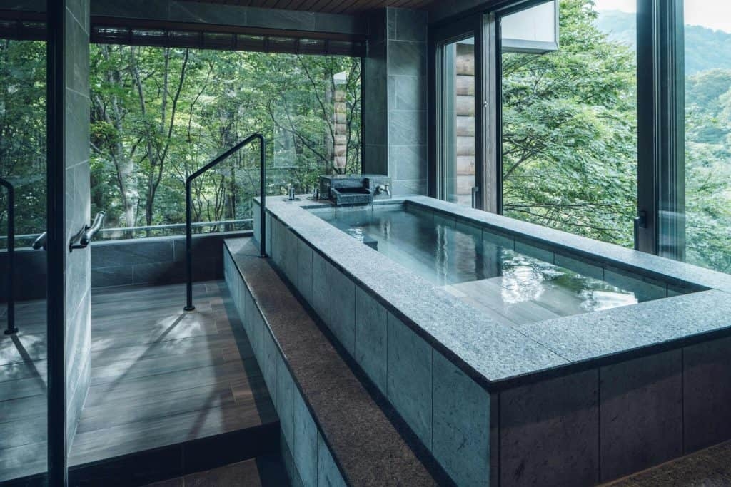 縦1.8メートル、横1メートルと、広々とした造りの客室温泉で、体を伸ばしてゆったりとくつろげます。窓からは奥入瀬渓流を見下ろすことができ、四季を通して新緑、深緑、紅葉、雪景色の絶景を独り占めしながら、好きな時間に好きなだけ温泉に浸かる贅沢を味わえます。