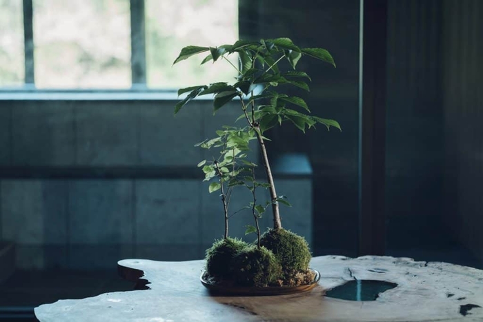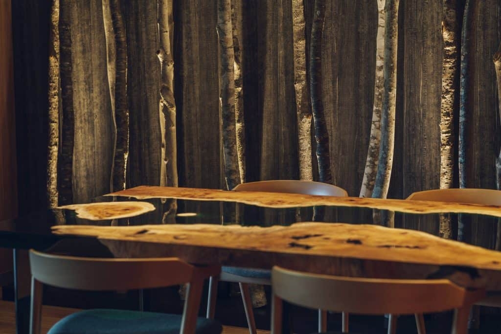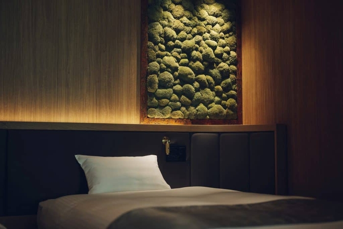 くつろぎながらも奥入瀬渓流の自然を感じられる、客室デザインを施しました。ベッドボードには奥入瀬渓流に生息する種類の苔を用いた壁画があり、本物の苔のふわふわした質感を楽しめます。インテリアウォールはこぶしの木を用いており、森の中でくつろいでいるかのような落ち着きを感じられます。ダイニングテーブルにはけやきと青いレジンを用いて、渓流の流れをイメージしたデザインに仕上げました。ランプシェードは奥入瀬渓流に生えるきのこ「ヒナノヒガサ」をイメージしており、柔らかい明かりが広がります。