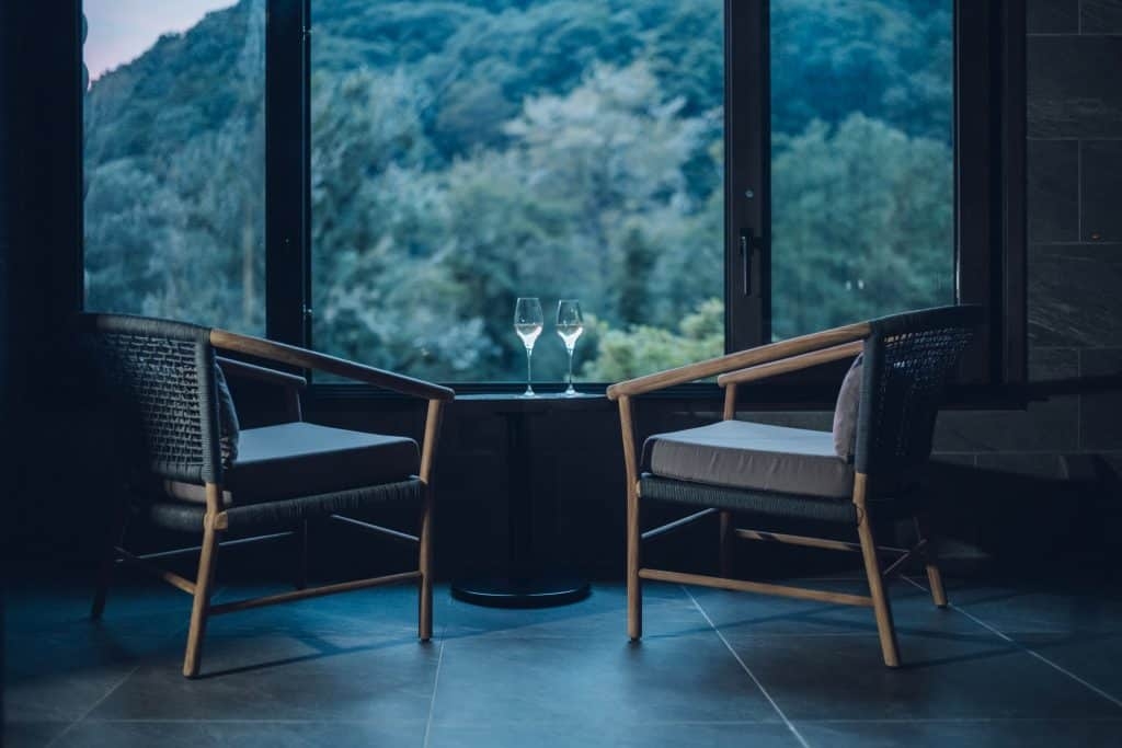 当客室に設えたコンサバトリー(*1)では、美しい渓流の景色を心ゆくまで満喫できます。渓流のせせらぎが楽しめる空間で、至福の時間を過ごすためのサービスを用意しました。