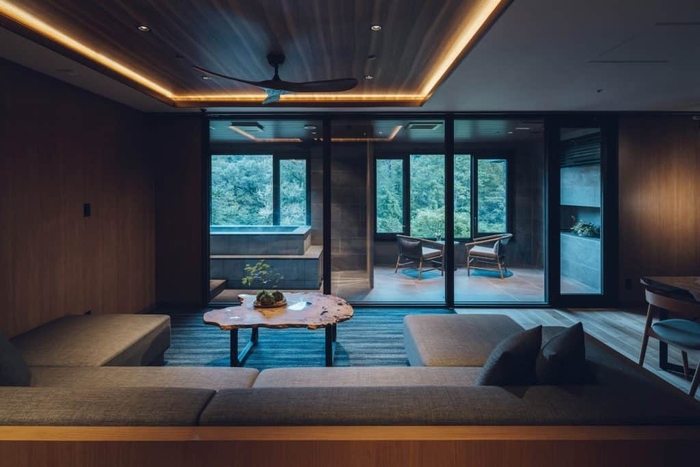 120平米の広々とした当客室では、四六時中せせらぎを感じ、渓流の絶景を独り占めできます。また、客室にいながらも、渓流の自然を感じ癒される、こだわりのデザインを施しました。