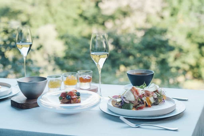 通常は当ホテルのフレンチレストラン「Sonore(ソノール)」のみで提供している銘醸ワインを、客室のコンサバトリーで味わえます。ソムリエが厳選した約150種類のワインから、そのときの気分や好みに合わせて選ぶことができ、渓流と過ごす客室を存分に楽しめます。渓流のせせらぎに耳を傾けながら銘醸ワインに舌鼓を打つ、最高の贅沢を堪能できます。