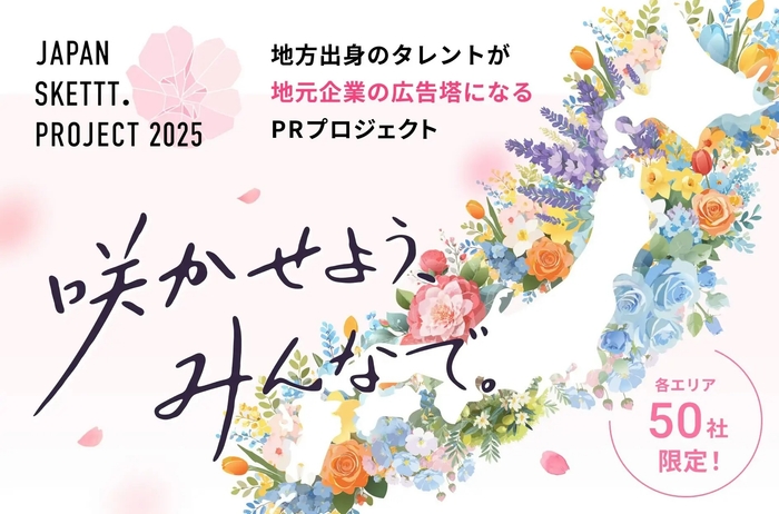 「JAPAN SKETTT. PROJECT(ジャパン・スケット・プロジェクト)」は、「咲かせよう、みんなで」をキャッチコピーに、地方出身タレントがPRでお困りの地元企業さまを支援するプロジェクトです。当プロジェクトでは、地方出身タレント、地方企業、ベンチャー企業が三位一体となって、地域経済の活性化を目指します。