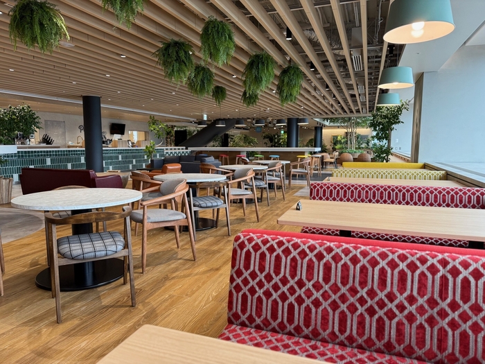 また、仕事の合間にリラックスできるよう、カフェスペースには至るところに緑を取り入れ、開放的な大きな窓から光が差し込む癒しの空間が広がります。カウンター席、ソファ席、丸型テーブル席などさまざまな席を備え、一人、大人数、パソコン作業、休憩にと、利用用途に合わせて自由にお過ごしいただけます(カフェはテイクアウト店として運営)。