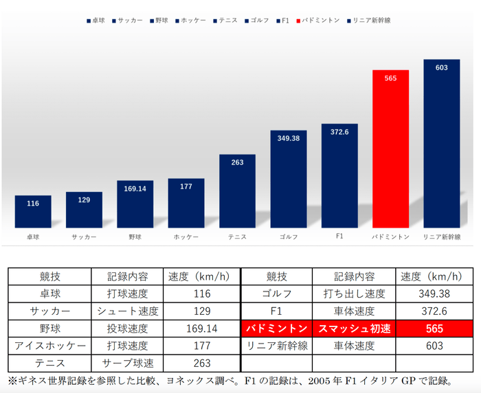 バドミントンスマッシュの最速タイム(男性):「565km/h」を達成。