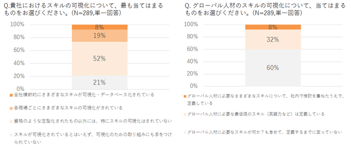 今回の調査では、既に「スキルの可視化」が進んでいると回答した企業は全体の28%にとどまりました。さらに、「グローバル人材のスキルの可視化」に限定すると、8%にまで下がります。グローバル人材に求められるスキルは、英語力はもちろん、異文化理解やそれを踏まえたうえでのマネジメントスキルなど多岐にわたります。日本企業がグローバルなビジネス展開を前提としてジョブ型雇用を推進していくには、「スキルの可視化」が喫緊の課題であると考えられます。