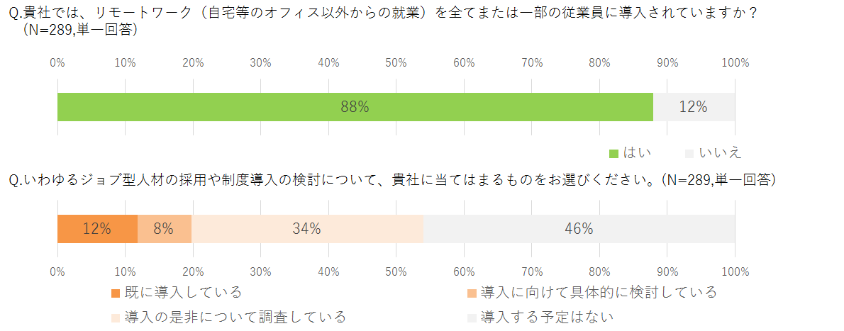 ① 約9割の企業でリモートワークを導入。半数以上の企業がジョブ型雇用導入を検討・予定