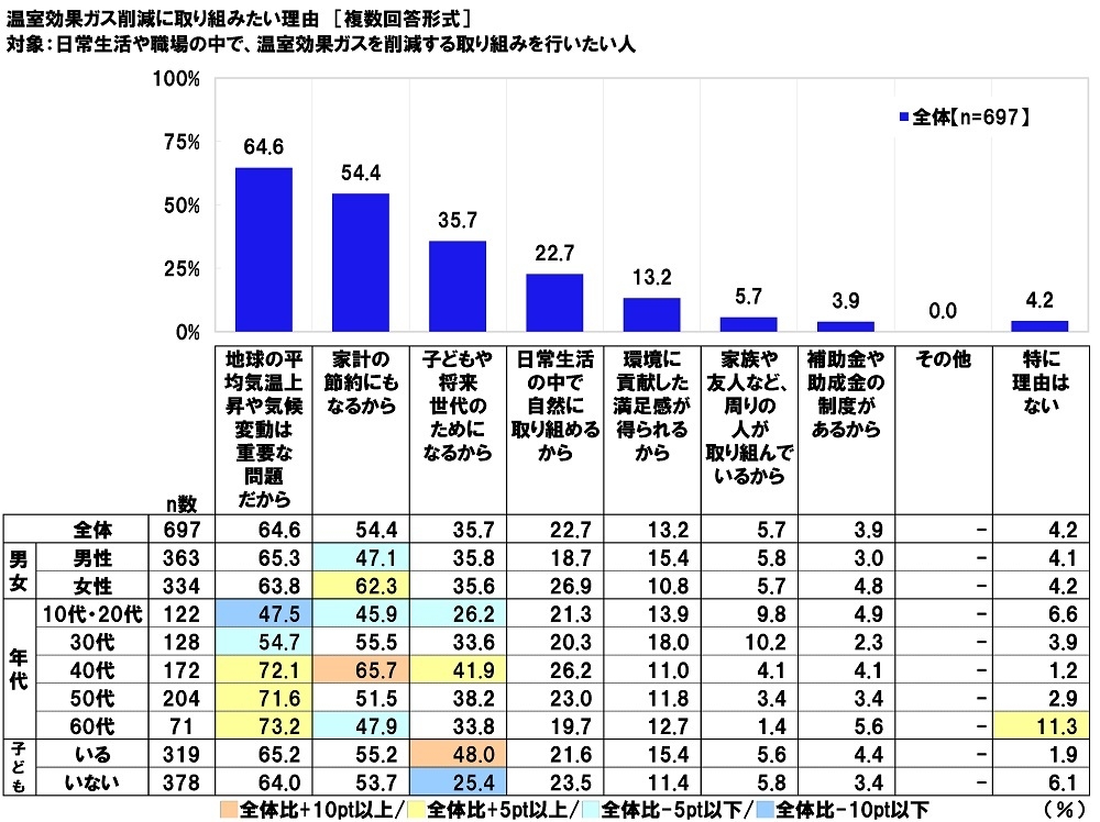 日常生活や職場の中で、温室効果ガスを削減する取り組みを行いたい人(697名)に、温室効果ガス削減に取り組みたい理由を聞いたところ、「地球の平均気温上昇や気候変動は重要な問題だから」(64.6%)が最も高くなりました。次いで高くなったのは、「家計の節約にもなるから」(54.4%)、「子どもや将来世代のためになるから」(35.7%)、「日常生活の中で自然に取り組めるから」(22.7%)、「環境に貢献した満足感が得られるから」(13.2%)でした。
