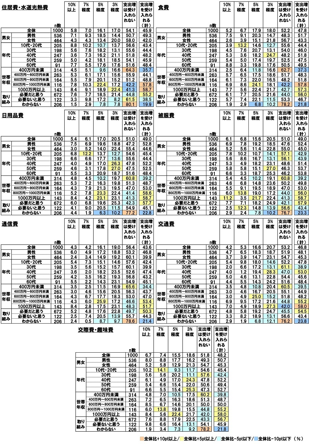 全回答者(1,000名)に、カーボンニュートラルに向けた取り組みのために、関連する衣食住や移動などにおける追加の費用負担は、どの程度まで受け入れられるか聞いたところ、いずれの費目でも「支出増を受け入れられる(計)」が50%弱を占める結果となりました。受け入れられる費用負担については「3%程度」や「5%程度」が中心でした。