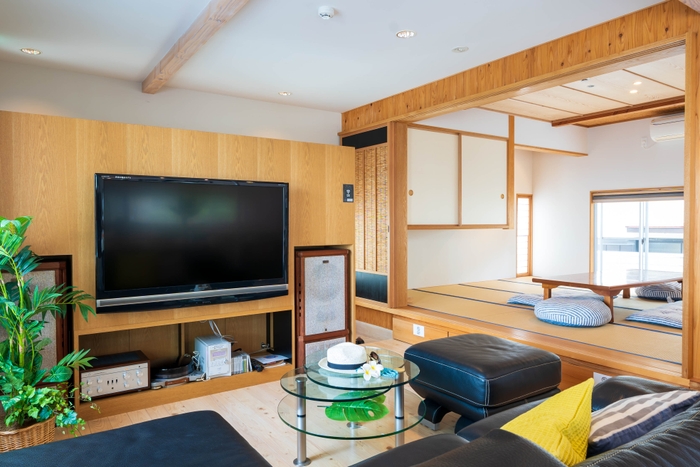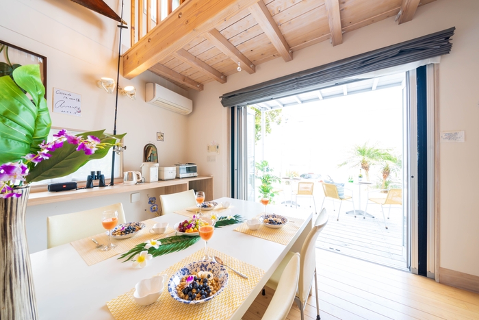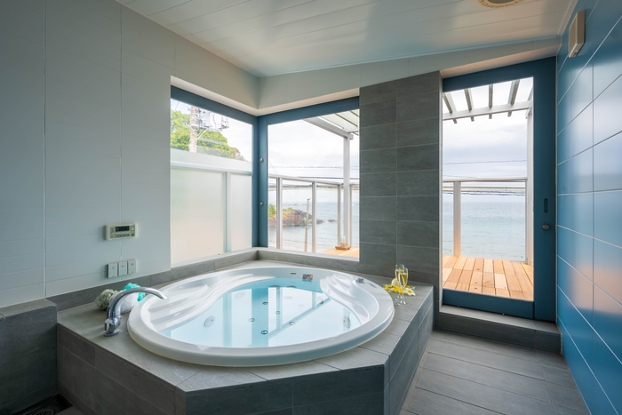 室内はデザインにこだわった快適空間で、2階の大きな窓とバルコニーからは海と空が広がる開放的なオーシャンビューが楽しめます。屋外にも海を一望する広々としたデッキテラスを備えており、アウトドア気分で汐風を感じながらお食事やご歓談をお楽しみいただけます。また、屋外シャワー(温水)を備えており、気軽に室内との出入りが可能なため、海水浴や磯遊びを楽しみたい方には最適な施設となります。さらにバスルームでは、ジェットバス・ミストサウナが完備されており、ゆっくり海を眺めながらの“整う”体験も楽しめます。