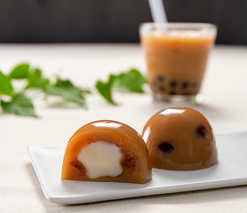 白餡ベースで優しい甘さのミルク餡を、タピオカ入りの香り高いミルクティー生地で包み込み、まるで“タピオカミルクティー”を飲んでいるかのような味わいに仕上げています。また、タピオカの食感がアクセントになったプルプルとした生地で、常温はもちろん、少し冷やすとひんやりとした口当たりで、よりいっそうおいしくお召し上がりいただける、夏にぴったりの商品です。