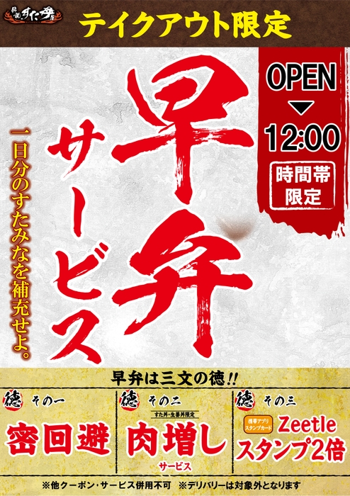 『早弁サービス』は、開店~12時までに持ち帰りを注文された方限定で、通常160円相当の「肉増し」が無料になり、さらにスマートフォンアプリスタンプカード「Zeetle」のスタンプが2倍になるキャンペーンです。