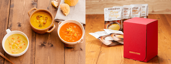 NISHIKIYA KITCHEN(ニシキヤキッチン)(株式会社にしき食品 本社:宮城県岩沼市、代表取締役:菊池 洋)は、年間12.3万人(※1)に贈られる「ニシキヤキッチンLINEギフト店」にて、2023年11月1日(水)より、「国産野菜たっぷりスープセット」を販売開始しました。本セットは、国産野菜たっぷりの食べるスープと、素材の味わいを生かしたポタージュが入っており、これから寒くなる冬におすすめのセットです。数量限定で冬限定の赤色のギフト箱に入れてお届けします。また、同じく販売中の「国産野菜の具だくさんスープセット」は、2022年7月~2023年10月までに累計6万セット(※2)を販売し、2022年のクリスマスには、LINEギフトで贈られた配送ギフト1位(※3)を獲得しました。寒い季節やホリデーシーズンの贈り物に喜ばれています。