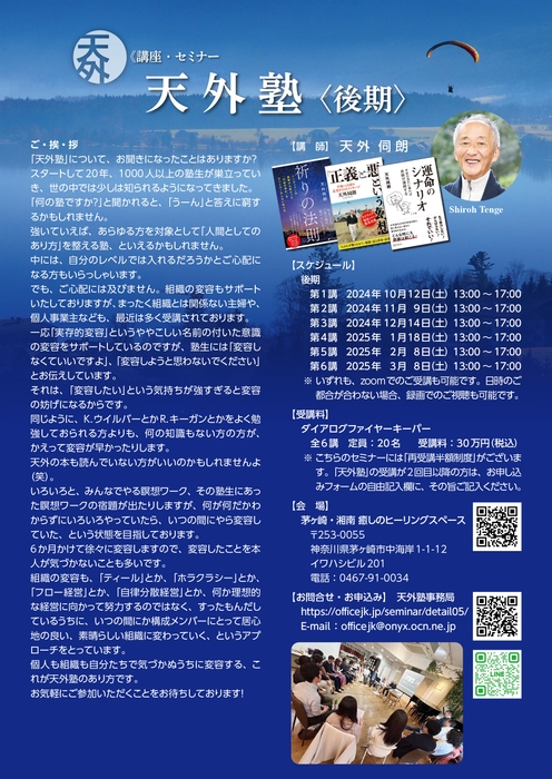 天外塾事務局(所在地:神奈川県茅ヶ崎市、代表:岡)は、天外伺朗(てんげしろう)主宰による「天外塾2024後期」全6講を2024年10月12日より開講します。また、各セミナー終了後には、録画配信も予定しております。