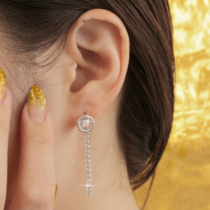 耳元で輝くダンシングストーンに、テニスチェーンを合わせたピアス。