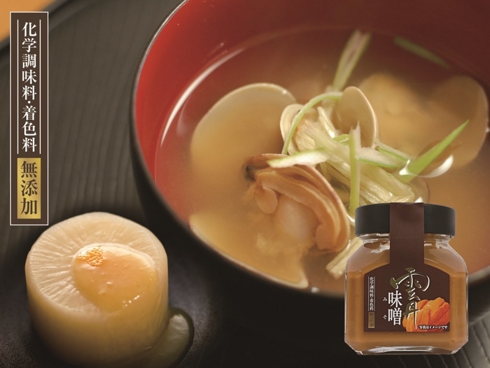 北海道産丸大豆を使用した味噌をベースに化学調味料・着色料無添加の雲丹醤油の原料をオリジナルの配合でブレンドしました。空知舎のだしを使用したことで雲丹の風味はもちろん、だしの旨味を感じられる今までにない新しい味噌となっております。