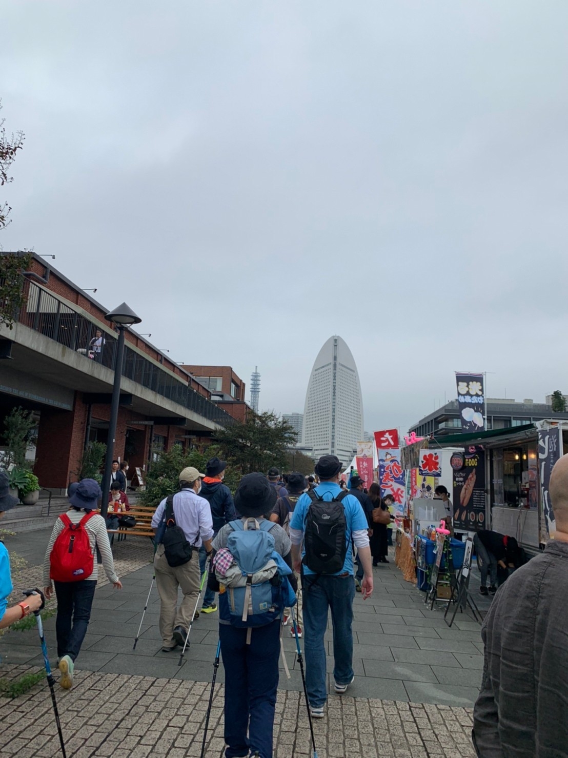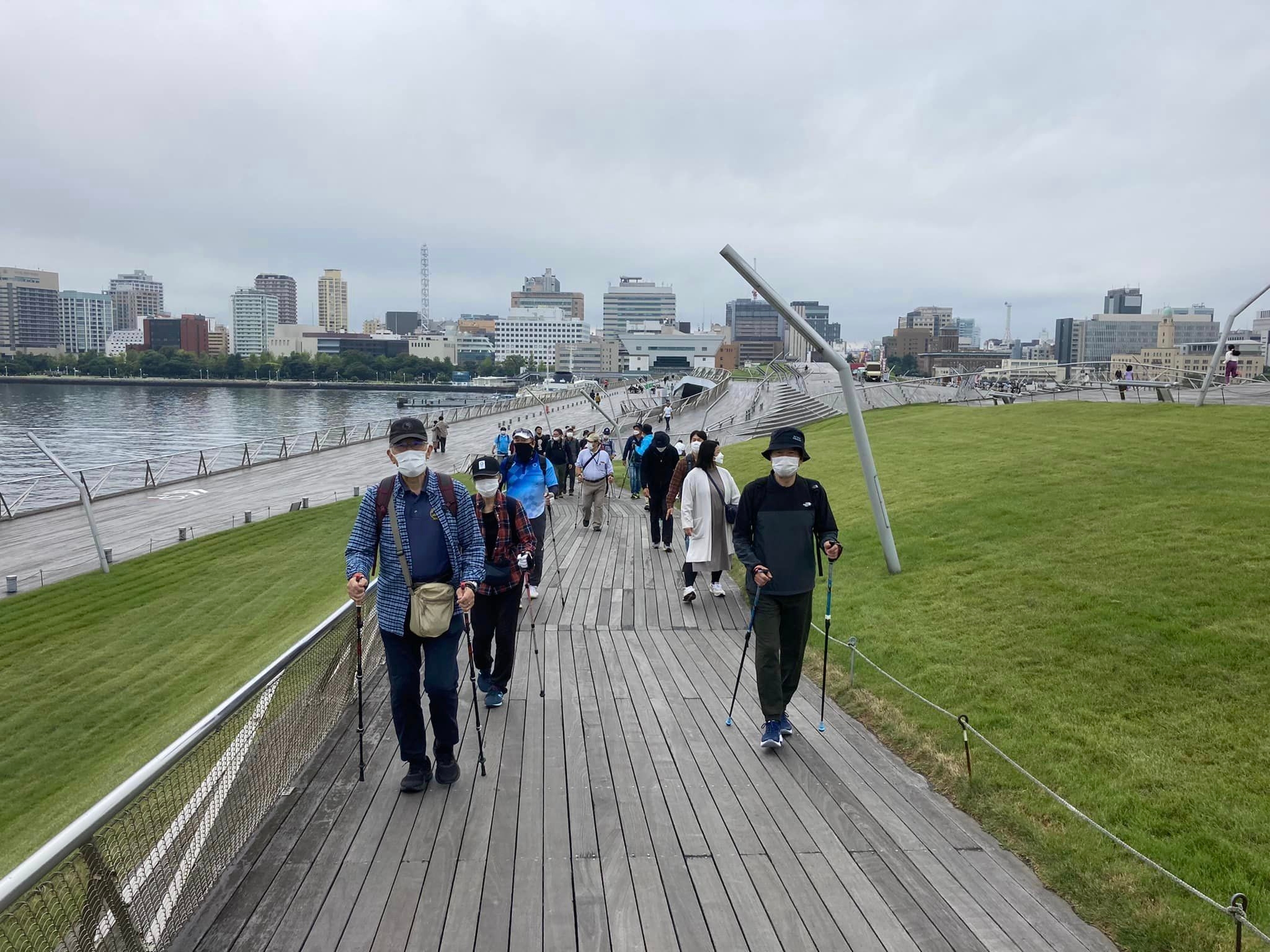 横浜・大さん橋ふ頭ビルに集合し、血圧&脈拍測定。ガイダンスを受けた後にストレッチを行い、ウォーキングを開始します。