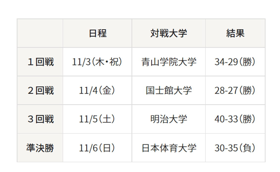 続く3回戦の明治大学との対戦では、連携が上手く機能し、チーム一丸となったディフェンスで準決勝進出。