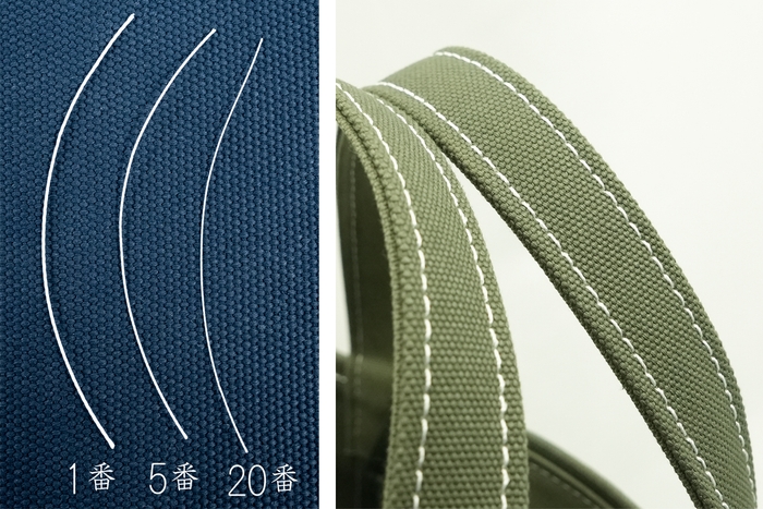 極厚生地に針を通す際に、糸には非常に強いテンションが加わります。この時、細い糸を使うと切れてしまうため、できるだけ太い糸を使う必要があります。今回は、上糸に極厚2号帆布にふさわしい超極太の1番手の糸を使い縫い上げていきます。更に、1番手の中でも樹脂を染み込ませた特殊かつ強靭な糸を使用します。1番手の糸で縫うことで、生地だけでなくステッチからも存在感と力強さを感じるトートバッグになります。
