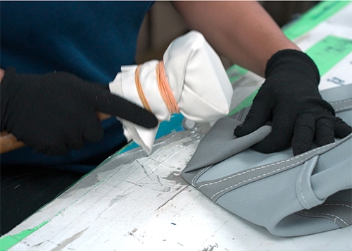 底マチを三角に折り畳んで縫うこのデザイン、これこそがトートに物を入れても型崩れせず、手にしたとき美しく見えることを可能にしています。縫製前にハンマーで叩いて、三角形を成形します。手間を惜しまず、この下準備を丁寧に行うことで、美しいトートバッグに仕上げることができます。