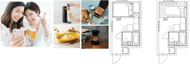 も快適な空間』を提供することをコンセプトとして洗濯乾燥機・電子レンジ・空気清浄機・ミニキッチン(一