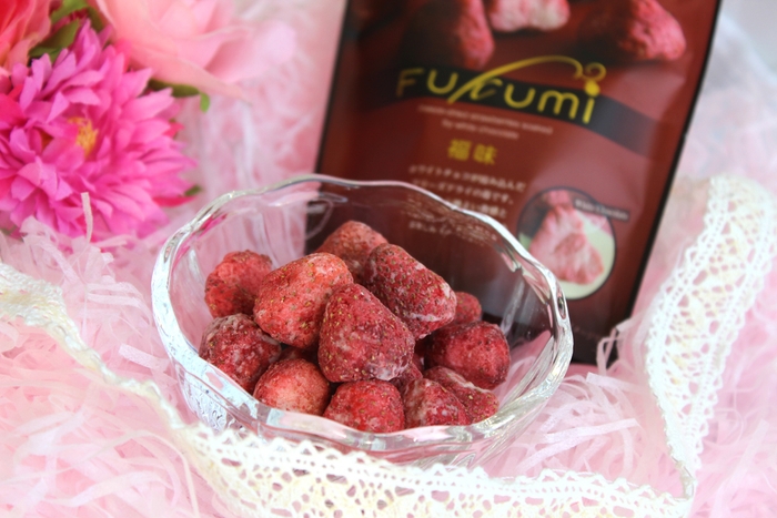 『福味』は、フリーズドライの苺に、厳選したホワイトチョコレートを浸み込ませたスイーツです。生の苺をそのままフリーズドライすると、苺の中に空間が生まれます。その空間に、特殊製法でホワイトチョコレートを浸み込ませることで、苺のサクッとした心地良い食感とホワイトチョコレートの口溶けが融合し、不思議な食感を生み出します。