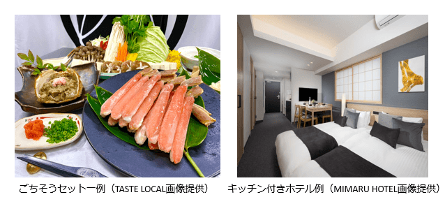 アパートメントホテル「MIMARU」(株式会社コスモスホテルマネジメント運営)に宿泊し、カニ鍋セット(仙台の老舗”かに八”のカニ鍋セット、地域のクラフトビール、宮古島のバスクチーズケーキ)や、秋のきのこ&牛すき鍋セット(山菜料理専門宿”出羽屋”の秋のきのこ・山形牛すき鍋、地域のクラフトビール、長崎の塩生キャラメル3種セット)など、四季折々に合わせた、旅工房オリジナルの”旬なごちそうセット“をご用意したプラン。宿泊は2名1室から6名1室までご宿泊いただけます。地域共通クーポンも利用すれば、楽しみ方の幅は無限大です。