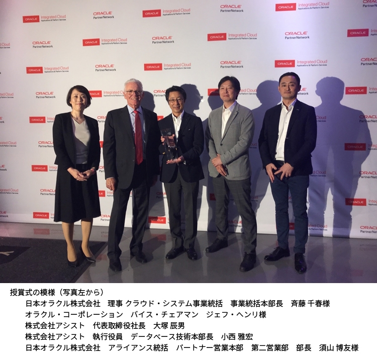 アシストは、ODAの提案、販売活動において、世界で最も著しい功績を挙げたパートナーとして、Oracle Excellence Awards for Specialized Partner of the Year: ODA - Globalを受賞しました。オラクルの2018年会計年度(2017年6月1日乃至2018年5月31日)において世界最多となるODAの販売実績、ならびにお客様の様々な課題解決を支援してきたことが高く評価されました。また、Oracle Databaseの高いナレッジに基づいた講演活動や、営業・技術者要員育成の積極的な推進における取り組みも評価されました。