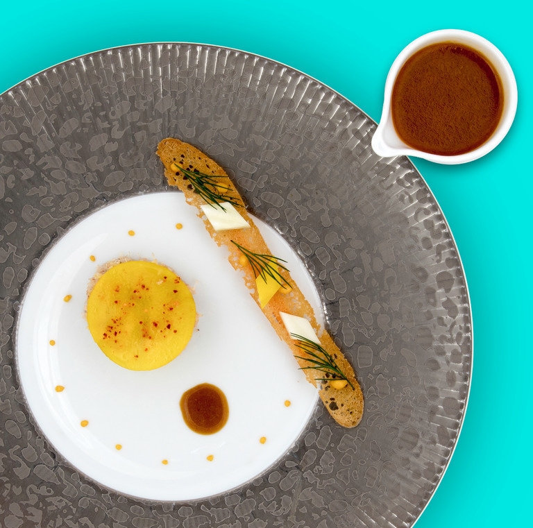 アルノー・ラルマンにとって、料理は子供の頃からの夢でした。ラルマンの父親はシャンパーニュ地方のランス近郊で家族経営のレストラン、「ラシエット・シャンプノワーズ」を開いていたからです。ラルマンは年若いころから有名なシェフ達の下で修行を積んで40歳を迎える前に「今年の最優秀シェフ」に選ばれ、ミシュランの三ッ星を獲得しました。ラルマンシェフの信念は余計な飾りや気取りのない、本質の料理の追求です。料理に於いても人生に於いても、常に本質を求めるーそれがラルマン流です。彼の目指す“本物の味”はエールフランスと共通の課題です。2017年の10月から12月末まで、ラルマンシェフ、エールフランス、ケータリング会社のセルヴェールの3者のコラボレーションによって誕生した素晴らしい美食の数々が機内で提供されます。メニューにはアカザ海老のロワイヤル風や仔鳩の料理といった、「ラシエット・シャンプノワーズ」の定番に加えて今回のために考案された黒トリュフのジャガイモニョッキ 黄ワインソースなどが並んでいます。