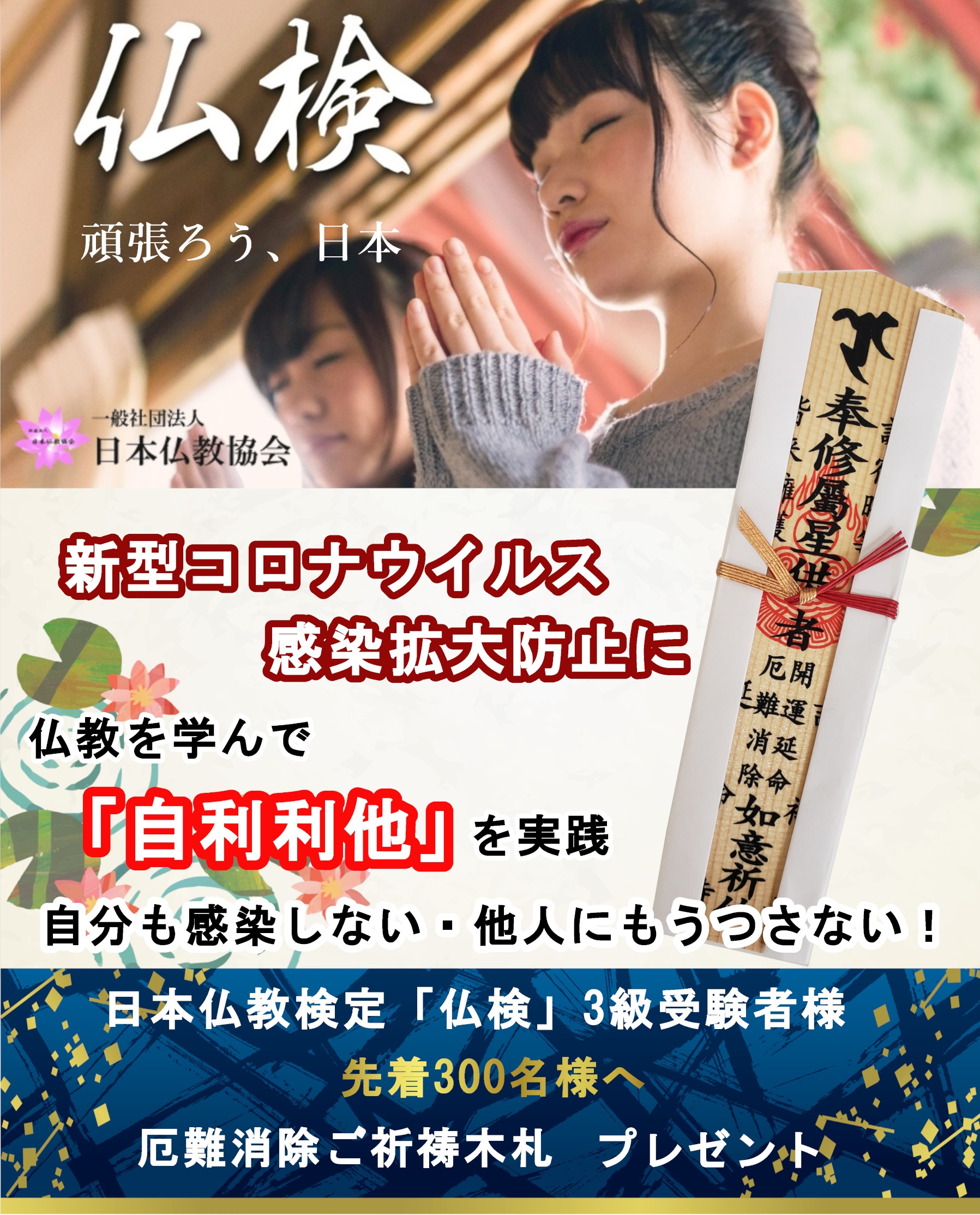 一般社団法人日本仏教協会(所在地:東京都千代田区)は、新型コロナウイルス感染拡大を背景に、不要・不急の外出の自粛の呼びかけがなされている中、自宅で学べる日本仏教検定3級の受験者先着300名様に「オリジナル木札(御札)」をプレゼントする企画を2020年4月13日(月)から実施いたします。