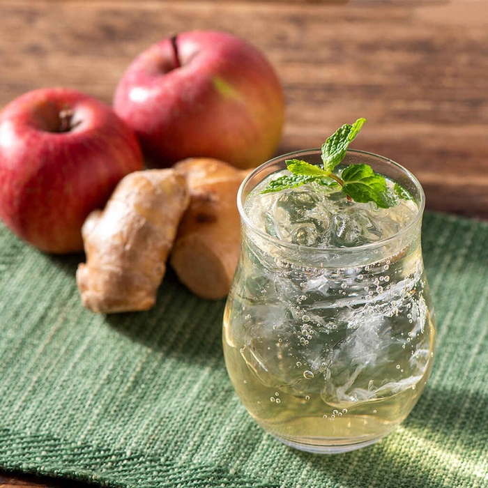 久世福商店初の組み合わせ!ピリッとスパイシーな辛みがアクセントになった、大人の味わいの「飲む酢」です。りんご果汁やりんご酢の甘みの中に九州産の生姜の風味が際立ち、清涼感のある後味が余韻に残ります。さらに白ワインビネガーも加え、上品な香りがふわっと鼻から抜けます。
