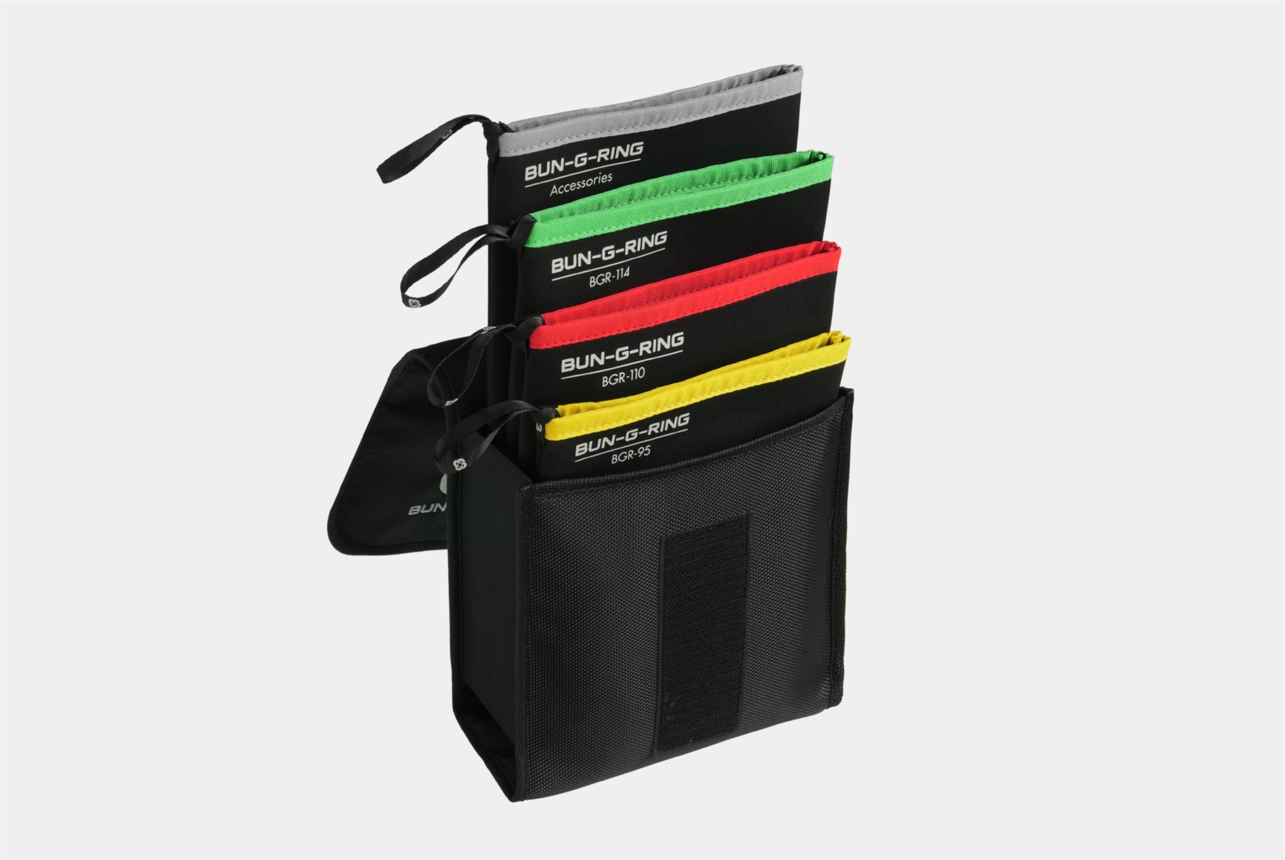 スタンダードキットには3つの色分けされたバンジーリングアクセサリー、ネオプレンスリーブ、キャリングポーチが付属。