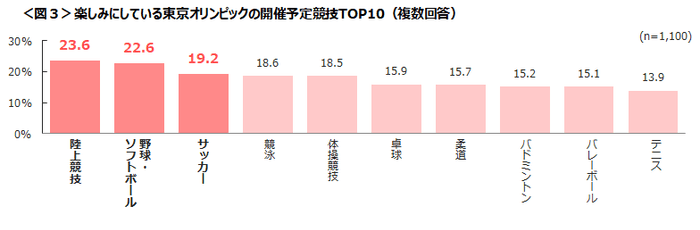 楽しみにしているオリンピックの開催予定競技は、「陸上競技」「野球・ソフトボール」「サッカー」
