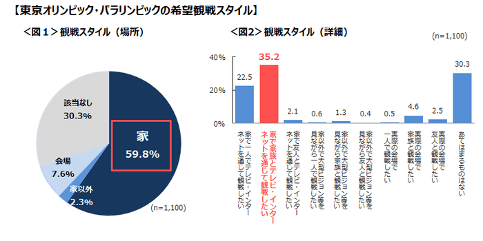 なかでも「家で家族とテレビ・インターネットを通じて観戦したい」が35%と一番高く、家以外及び現地観戦スタイルは1割にとどまる。<図1> <図2>