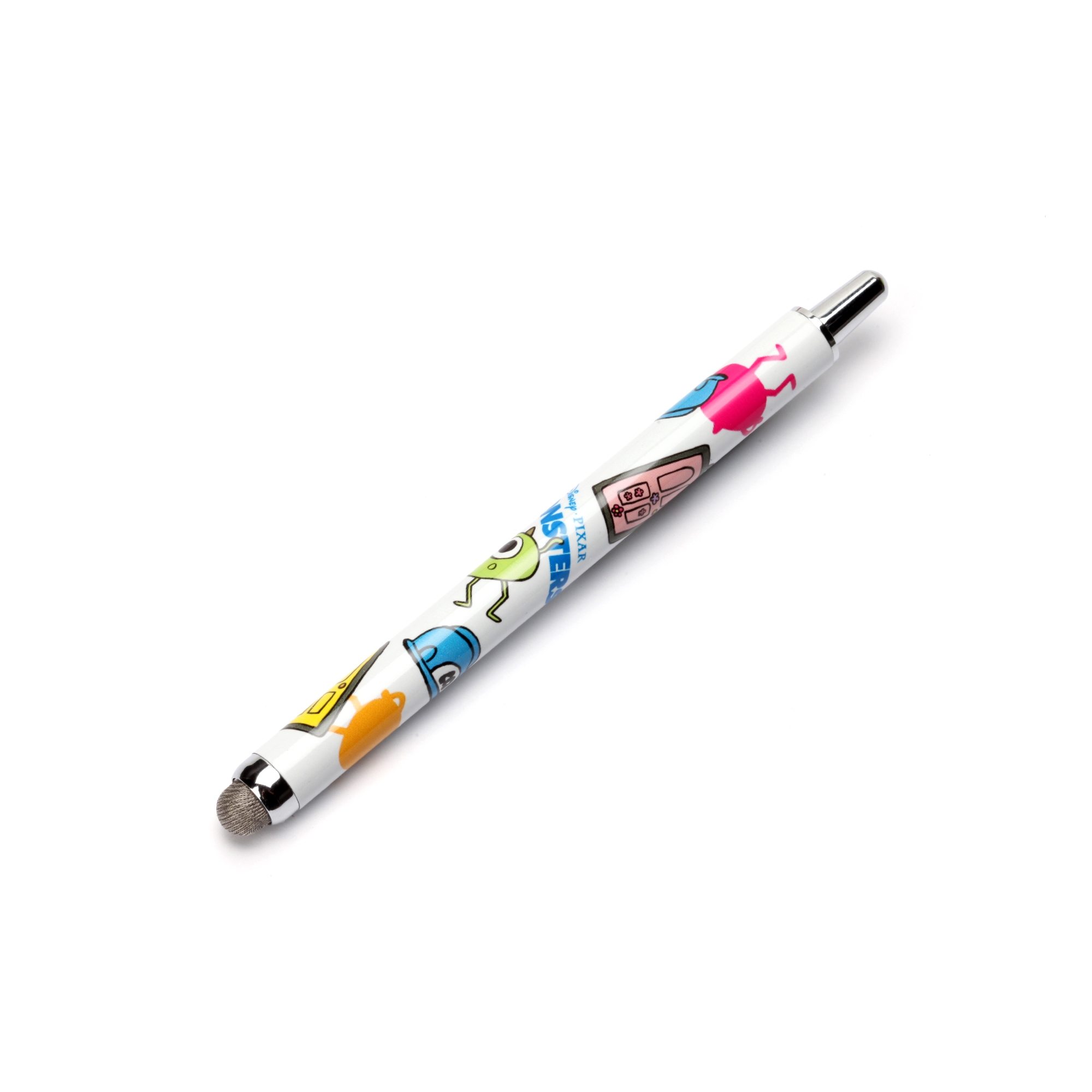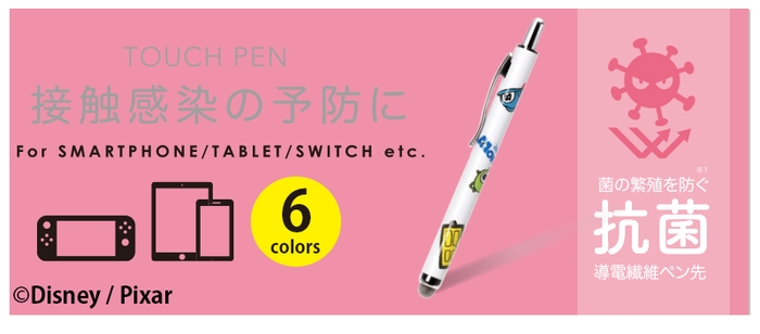 ディズニーキャラクターデザインのスマートフォンやタブレット、ATMやエレベーター等日常生活の様々なタッチ操作を指で触れずに行えるノック式タッチペンです。ペン先は菌の繁殖を防ぐ抗菌仕様。また、導電繊維を使用しているのでイラストや文字を書く際には滑りの良い、サラサラとした書き心地を楽しめます。ノック式仕様でペン先の劣化を防ぎ、片手で簡単収納が可能です。胸元のポケットや小さなショルダーバッグに入れて持ち運びにも便利な太さ9mmのコンパクトサイズ。