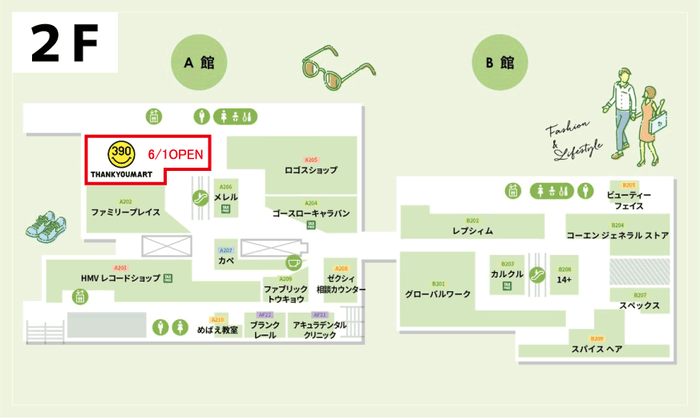 場所はA館2F、ファッションや雑貨店といった注目専門店がぎゅっとつまったフロアです!