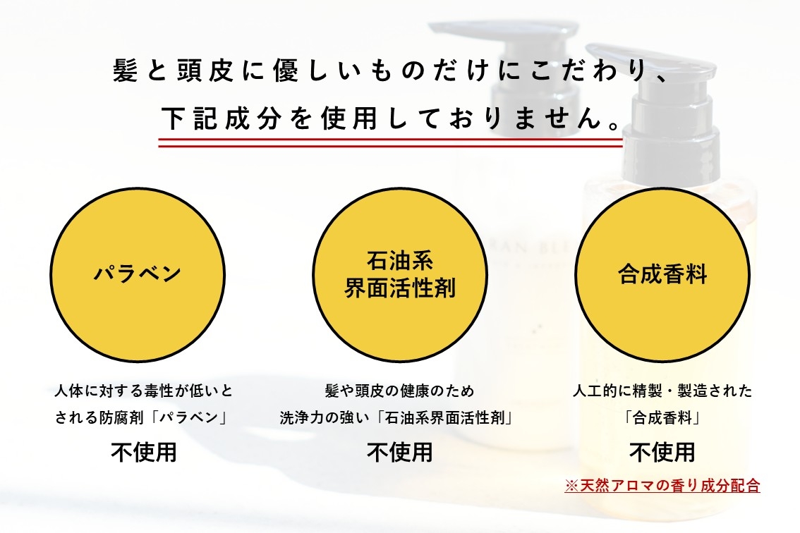 グランブレンドでは、髪と頭皮に優しいものだけにこだわり、パラベン・石油系界面活性剤・合成香料は使用しておりません。