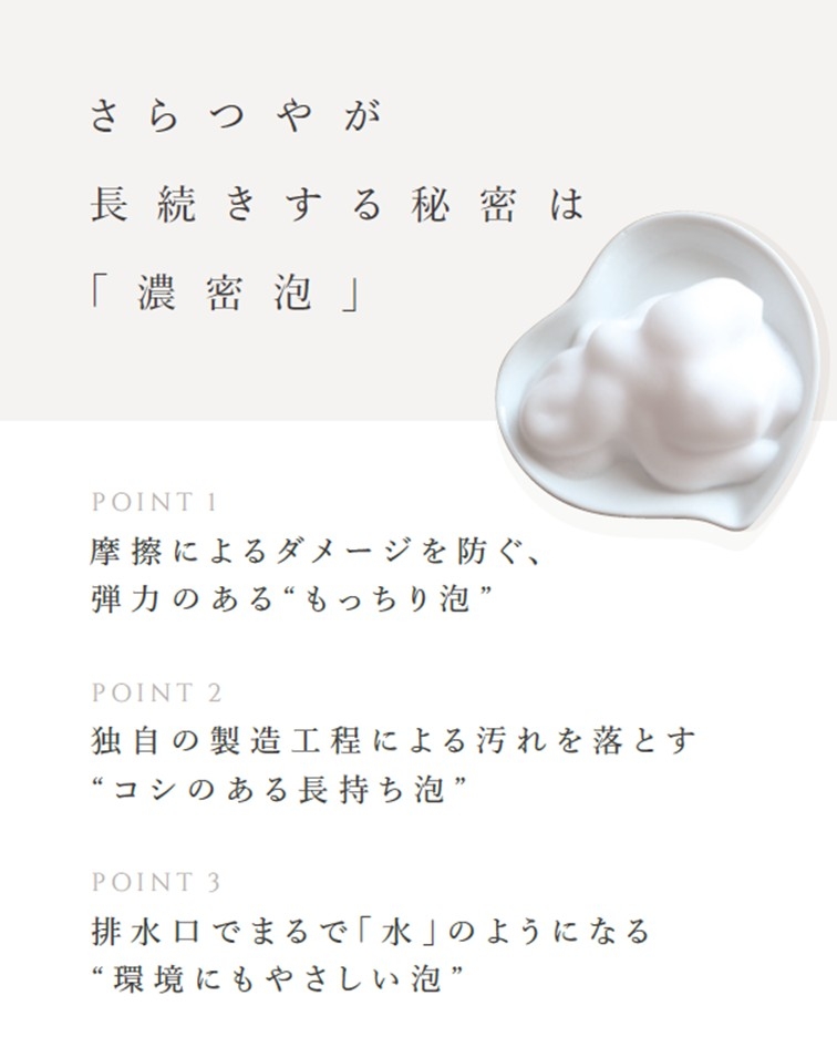 美容成分の処方・配合方法が実現するもっちりとしたコシ・弾⼒のある泡は他には真似のできない⼿仕事です。