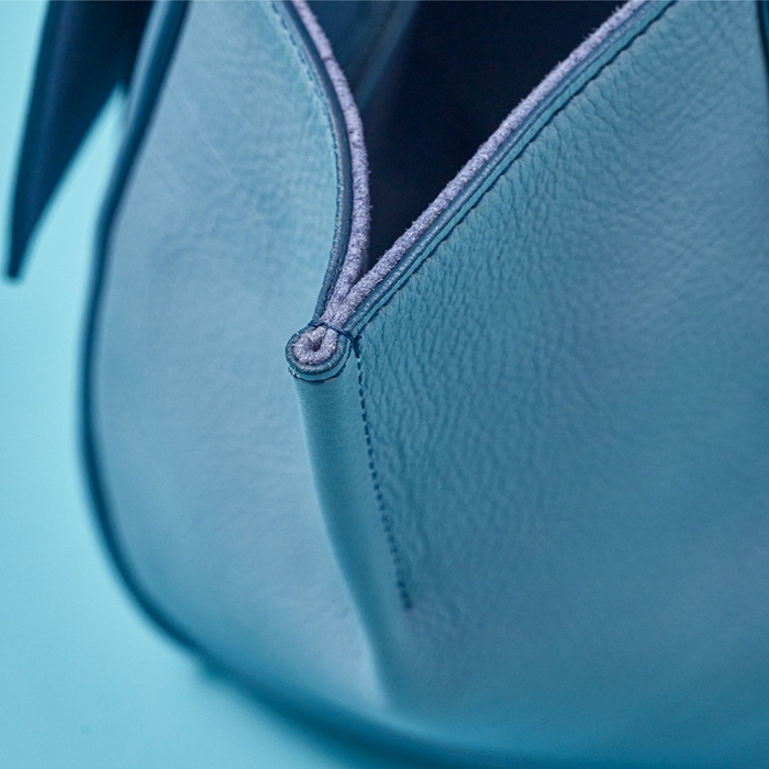 一本の継ぎ目がまっすぐに伸びた「道」のようなつまむディテールは、折り曲げた革の端の下にさらにコバ仕上げの革のピースを重ねることで膨らみを持たせています。そのさりげない陰影によって、豊かな表情がうまれます。