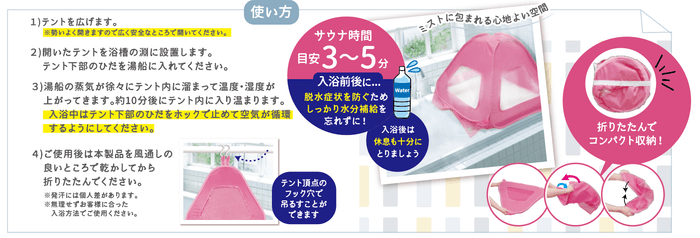 自宅の湯船の上にテントを広げるだけで、湯船の湯気や熱を閉じ込めます。ミストサウナの利点は保湿効果があること。髪などの乾燥が気になるというサウナの欠点もミストサウナなら気になりません。おうちのお風呂で使うフィンランド風ミストサウナテントで温活&デトックスしてみませんか?