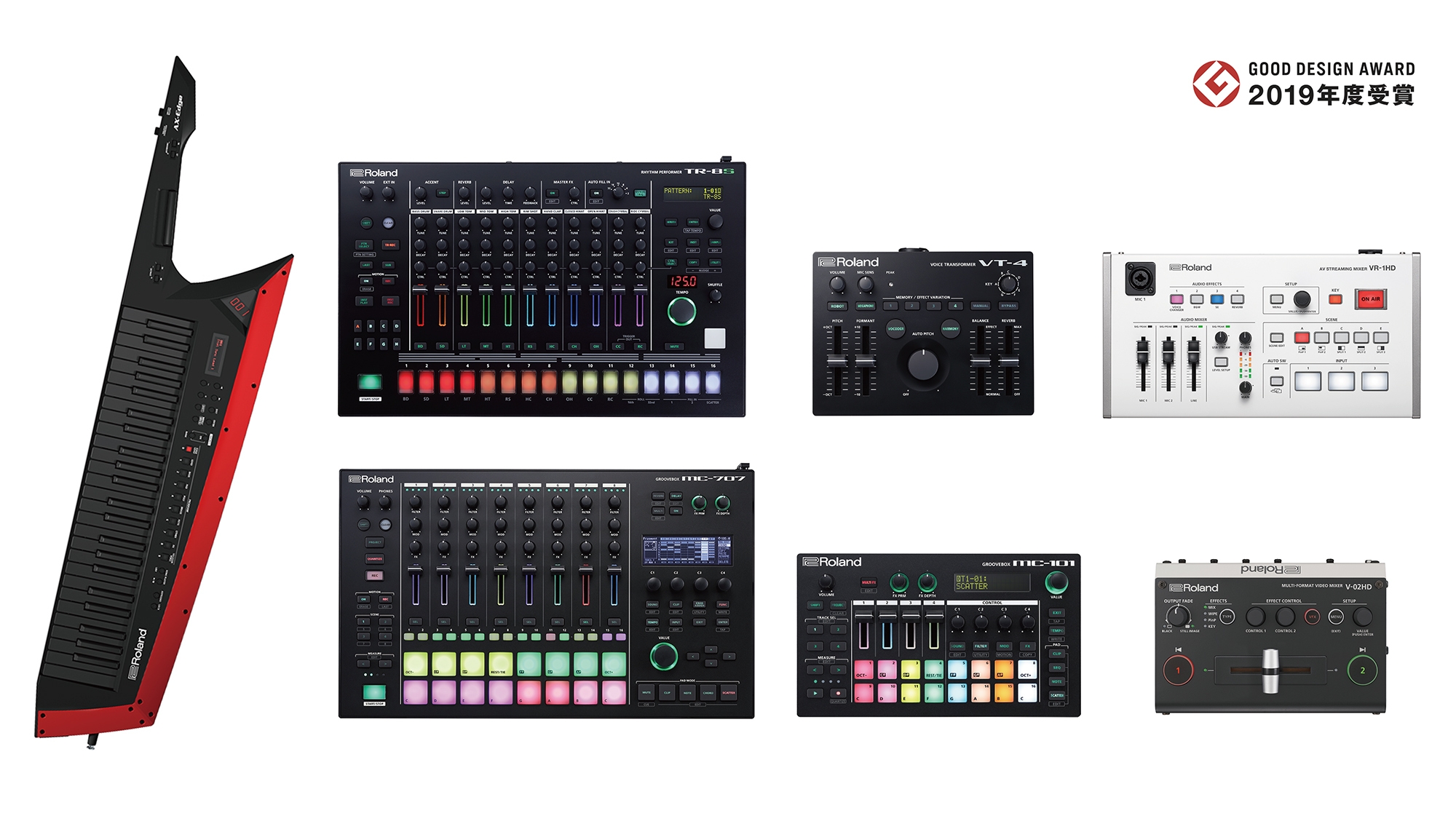 ローランド株式会社のショルダー型シンセサイザー『AX-Edge』、エレクトロ・ミュージック・シーンにおいて最先端のサウンドとパフォーマンス性を提供する『AIRAシリーズ』(『TR-8S』、『VT-4』、『MC-707』、『MC-101』)、映像機器『VR-1HD』、『V-02HD』が、「2019年度グッドデザイン賞」(主催:公益財団法人日本デザイン振興会)を受賞しました。