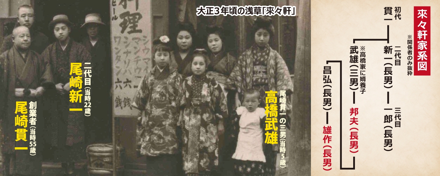 浅草「來々軒」の復活にあたり協力を得たのは、創業者・尾崎 貫一氏の三男である、高橋 武雄氏(大正期に高橋家に婿養子)の長男、高橋 邦夫氏、そして貫一氏の玄孫にあたる高橋 雄作氏です。高橋 武雄氏は、尾崎 貫一氏の長男である、二代目・尾崎 新一氏が36歳という若さで亡くなり(昭和2年)、亡くなった直後から戦前まで、來々軒を支えた人物です。