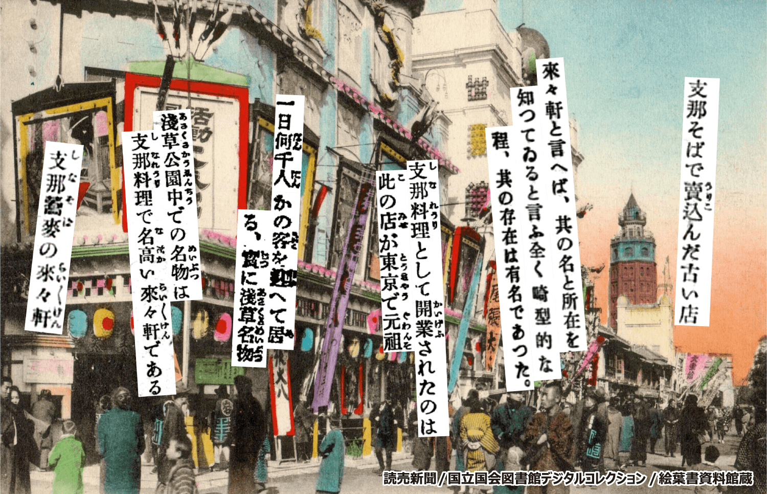 來々軒にまつわる文献は数多く存在します。「一日何千人かの客を迎へて居る、実に浅草名物」(読売新聞)、「支那そばで売込んだ古い店」(大東京うまいもの食べある記)、「來々軒と言へば、其の名と所在を知ってゐると言ふ全く畸型的な程、其の存在は有名であった」(浅草経済学)。これらの文献から、來々軒がいかに有名で繁盛していたかが伺えます。